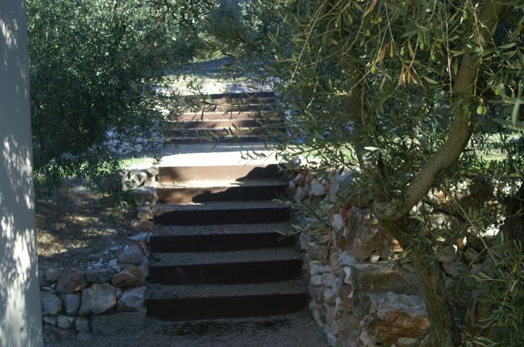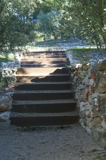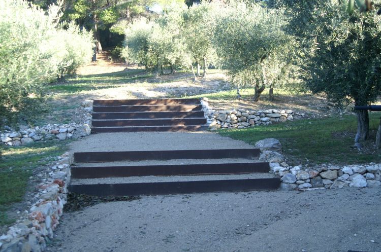 Les murets en pierre sèche soutiennent des restanques accessibles par des escaliers enherbés ou en gravier soutenue par des plaques de fer de 20 cm de haut et de longueurs allant de 1 mètre20 à 6 mètres.